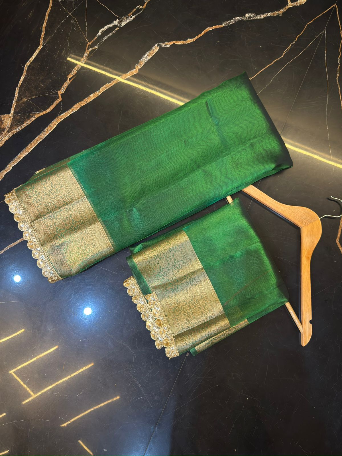 Add timeless elegance to your ethnic collection with this beautiful Emerald Green Banarasi tissue saree. Crafted from premium tissue fabric, the saree features a soft natural sheen and is finished with rich attached lace work on the borders, giving it a luxurious and graceful appeal.